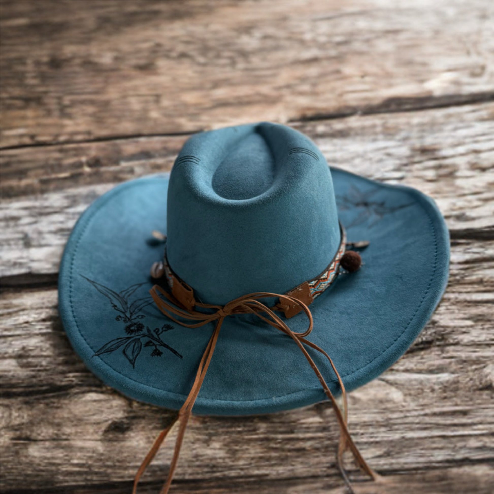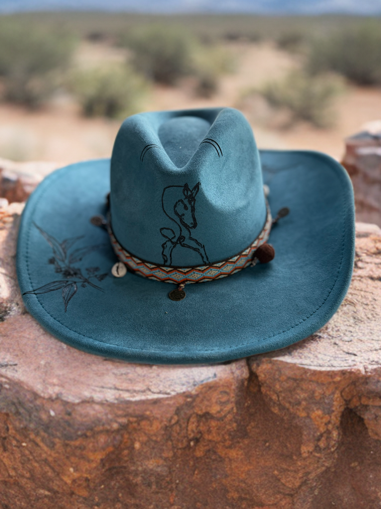 “Branded by Flame” is a collection of hand-altered hats — each one uniquely burned, banded, and styled with custom fabric and rustic decals. These hats carry character, crafted to tell your story in every singed line and stitched strip.