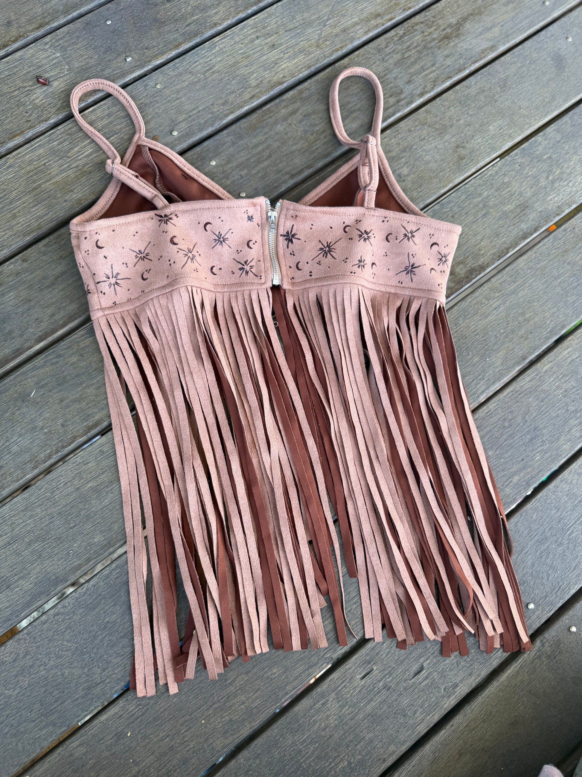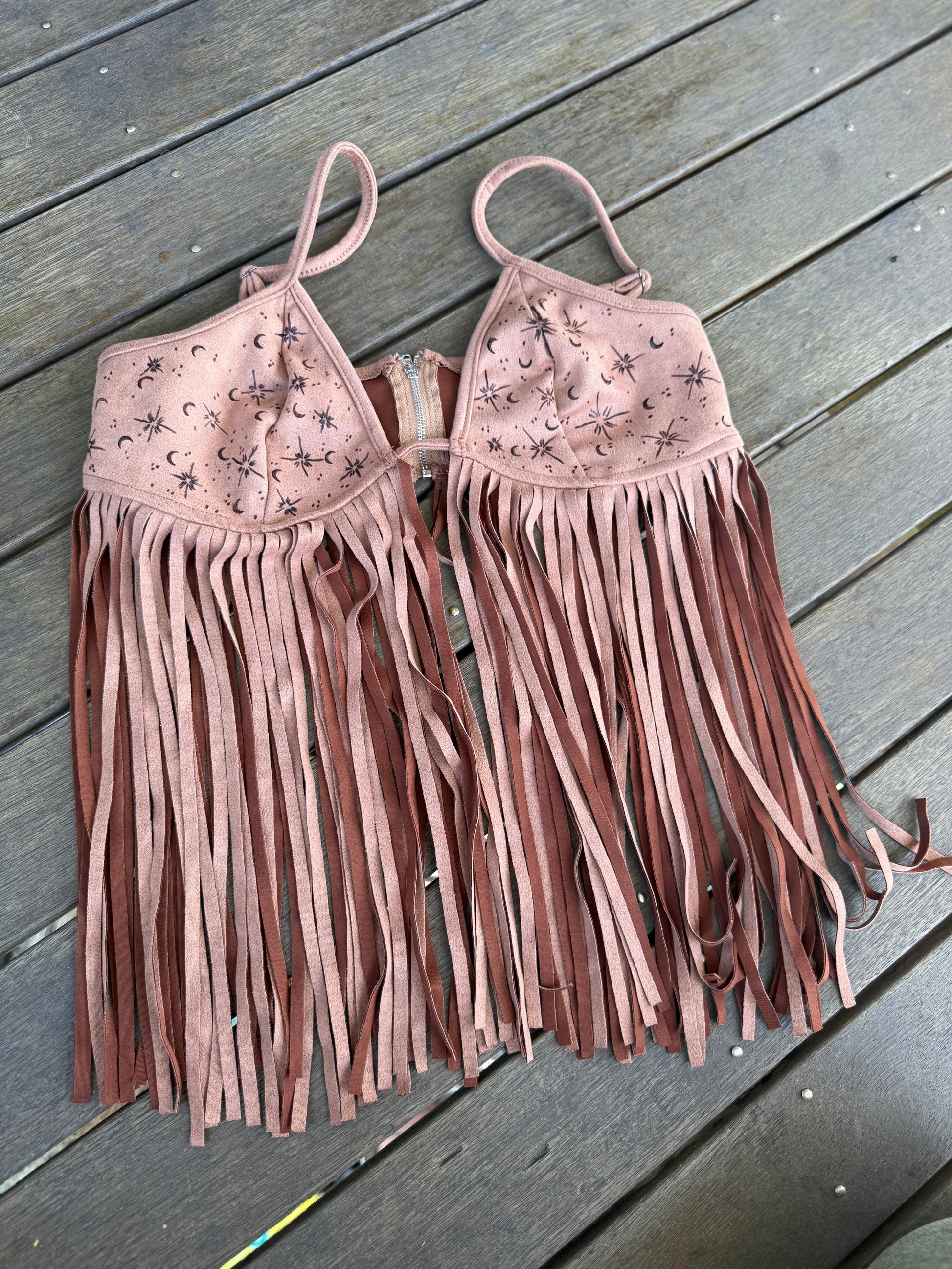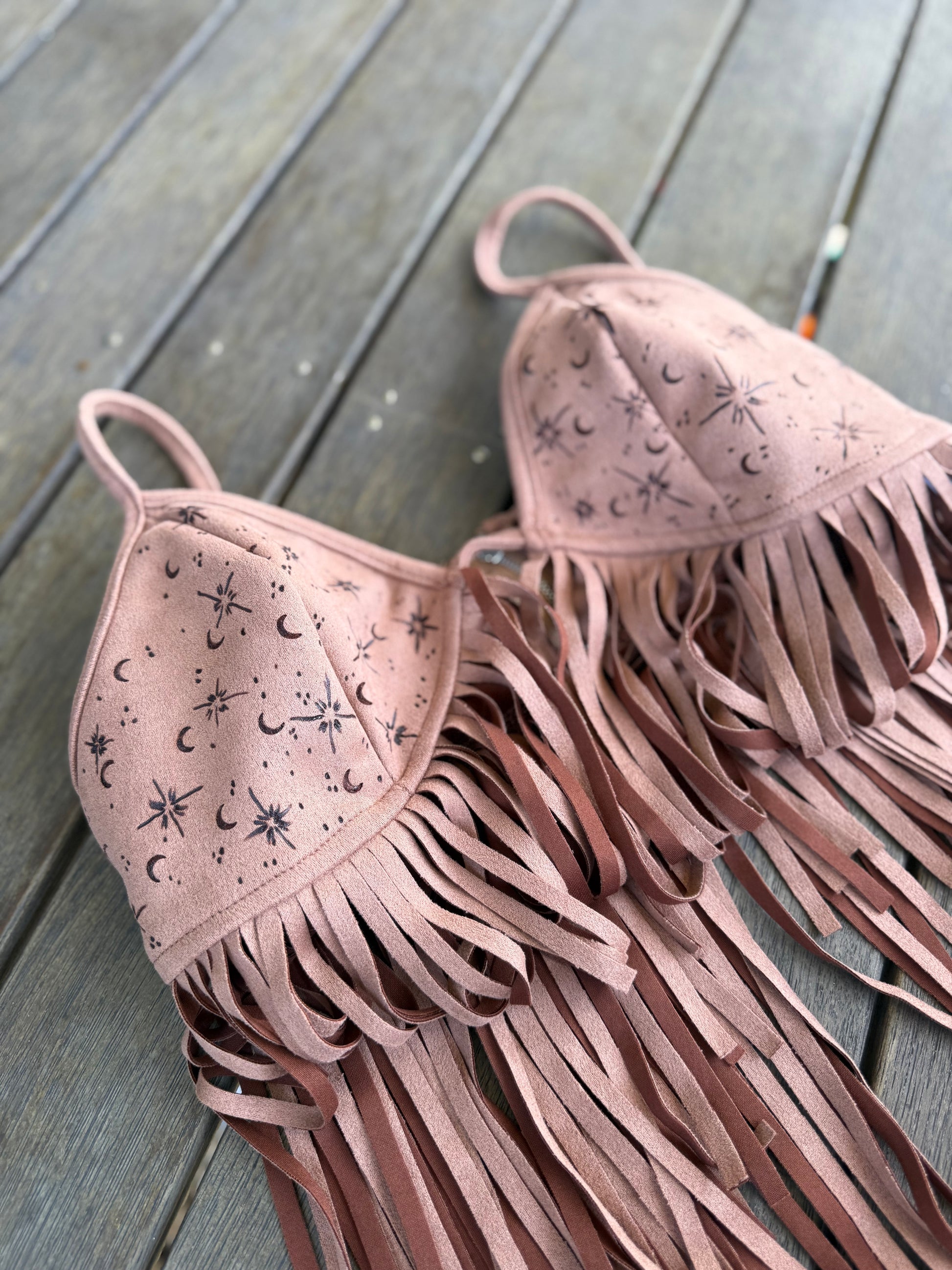 Each top is a one-of-a-kind creation, hand-burned with designs that shift like the embers—astrology, mythical symbols, wild florals, and raw rustic motifs. With ruffled lace-up details and free-flowing tassels, it’s made for those who wander untamed, dancing beneath the stars and chasing the warmth of the sun.