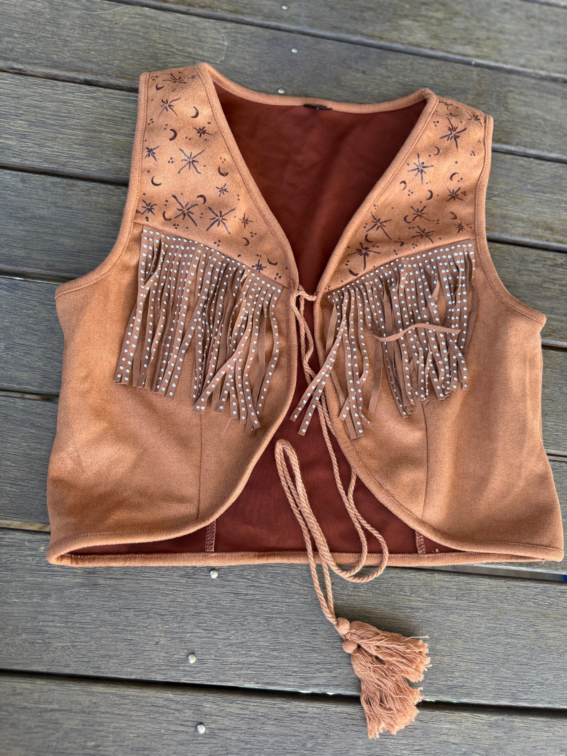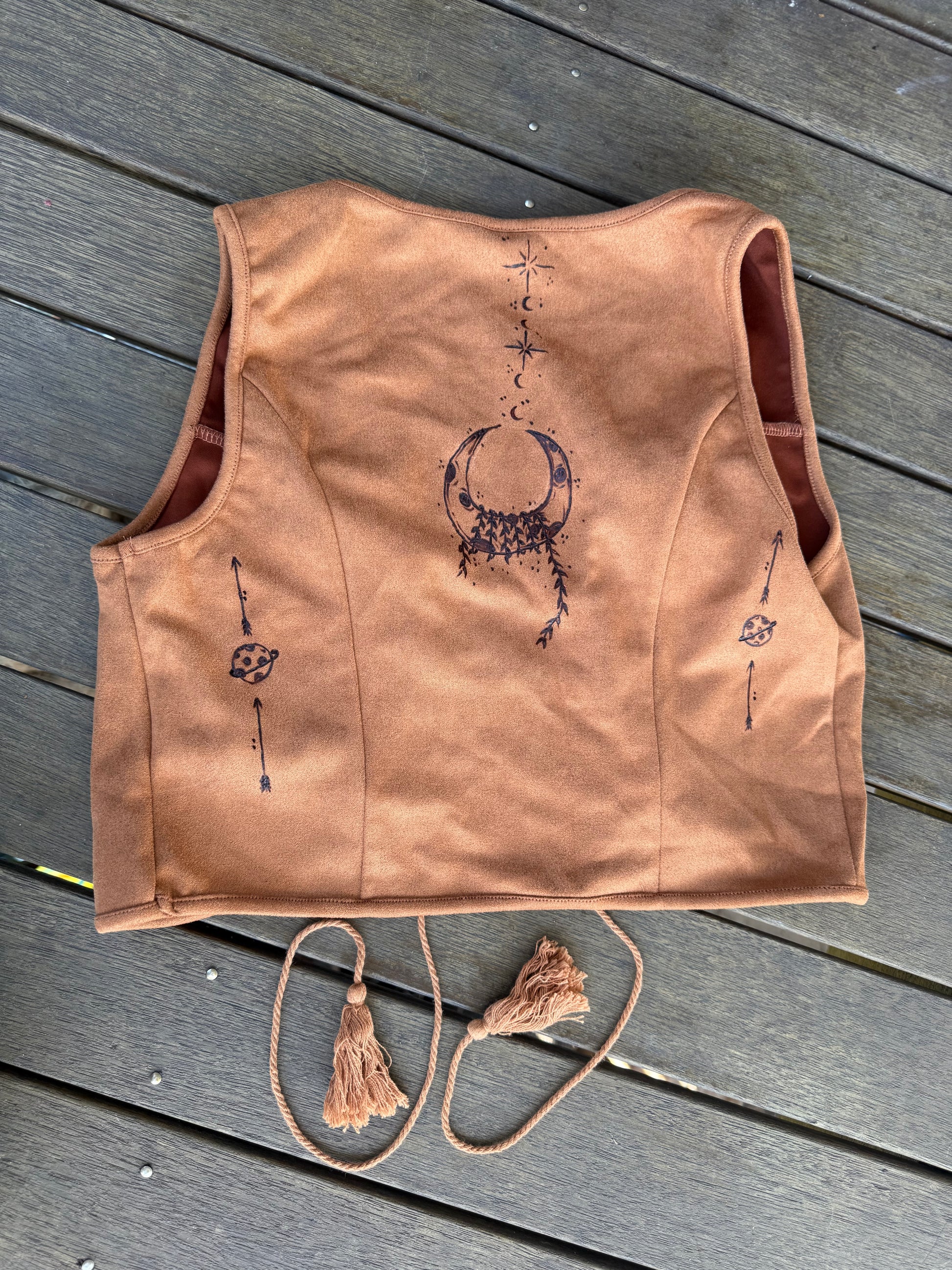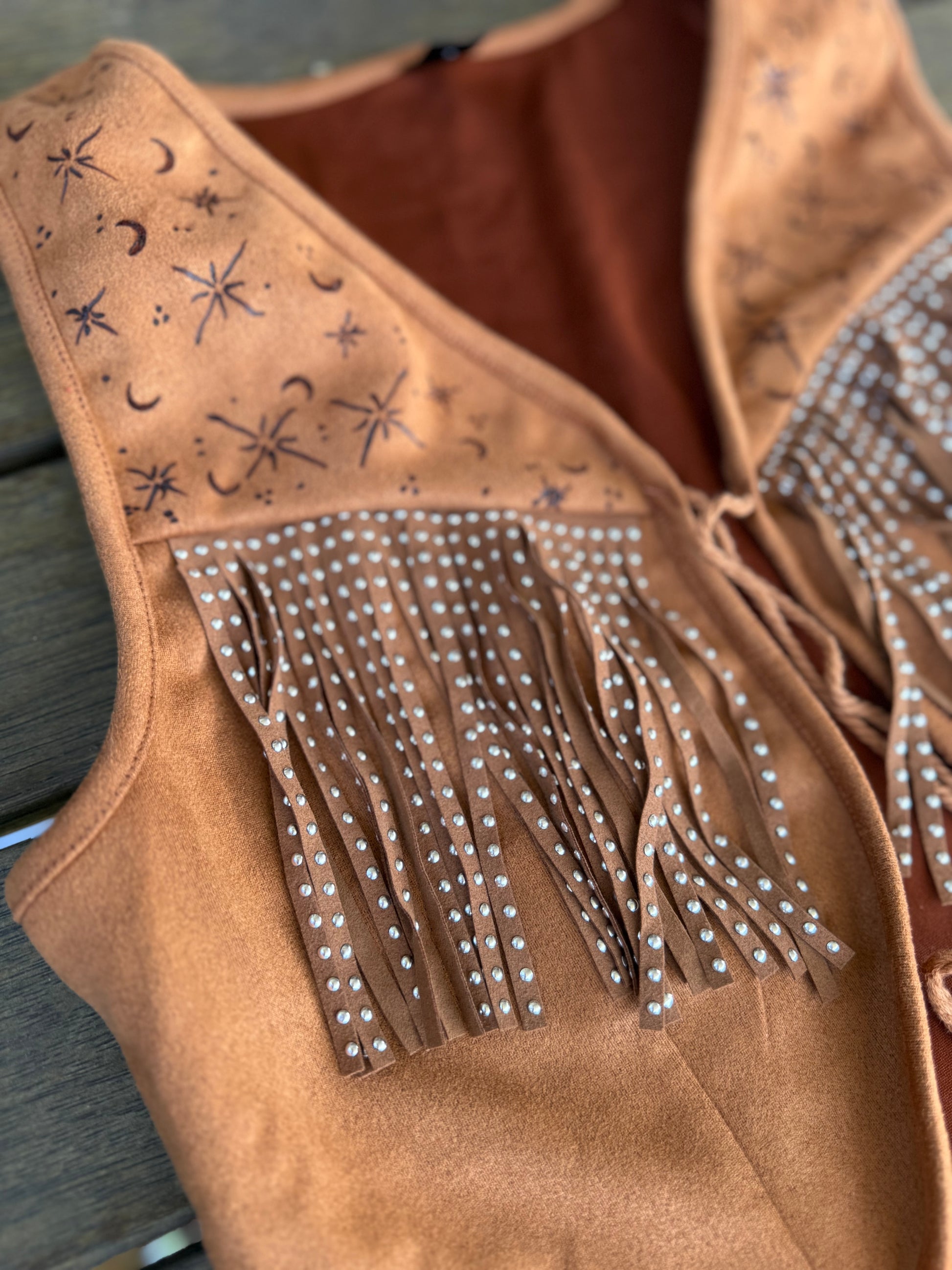 Each top is a one-of-a-kind creation, hand-burned with designs that shift like the embers—astrology, mythical symbols, wild florals, and raw rustic motifs. With ruffled lace-up details and free-flowing tassels, it’s made for those who wander untamed, dancing beneath the stars and chasing the warmth of the sun.