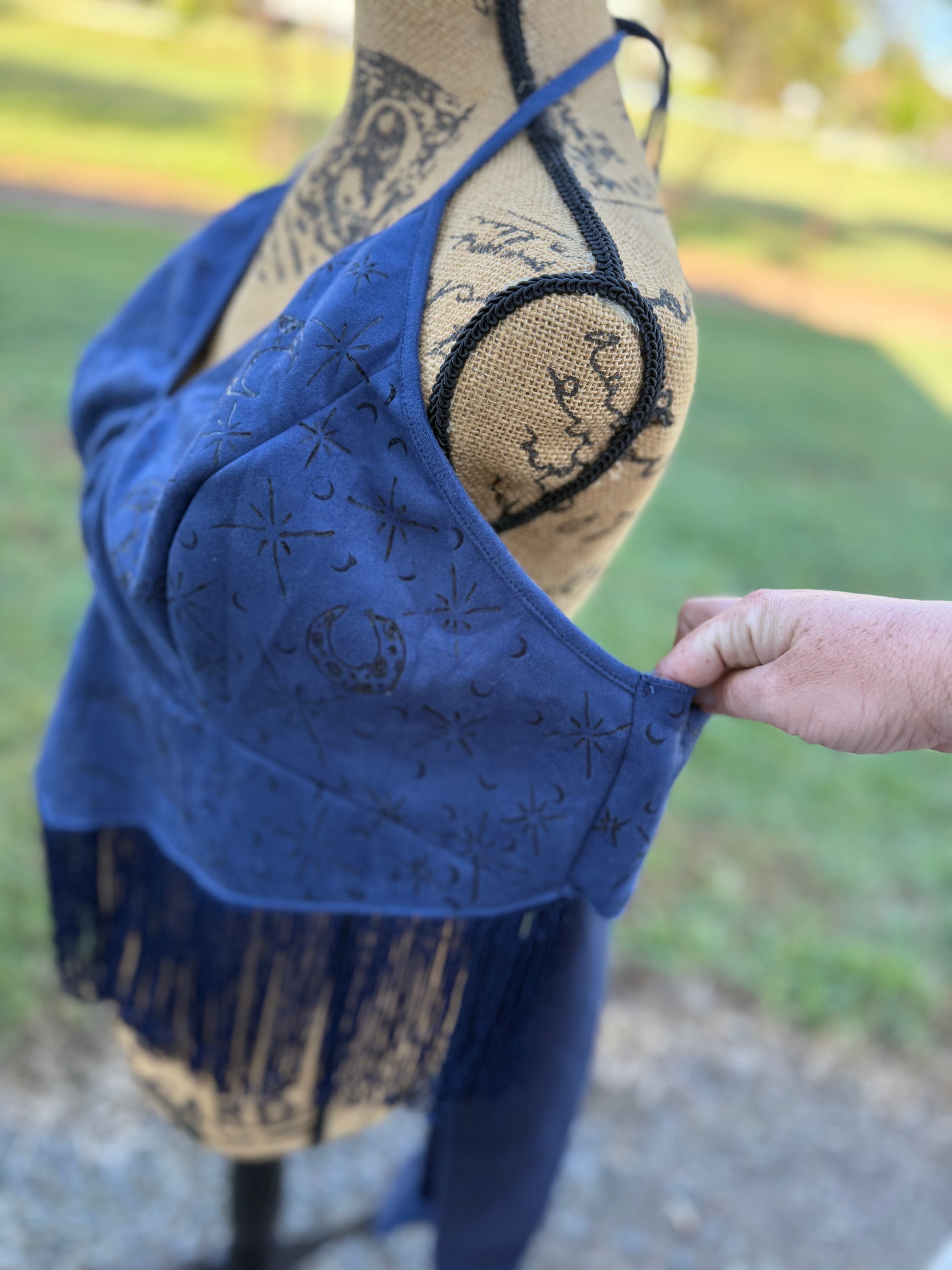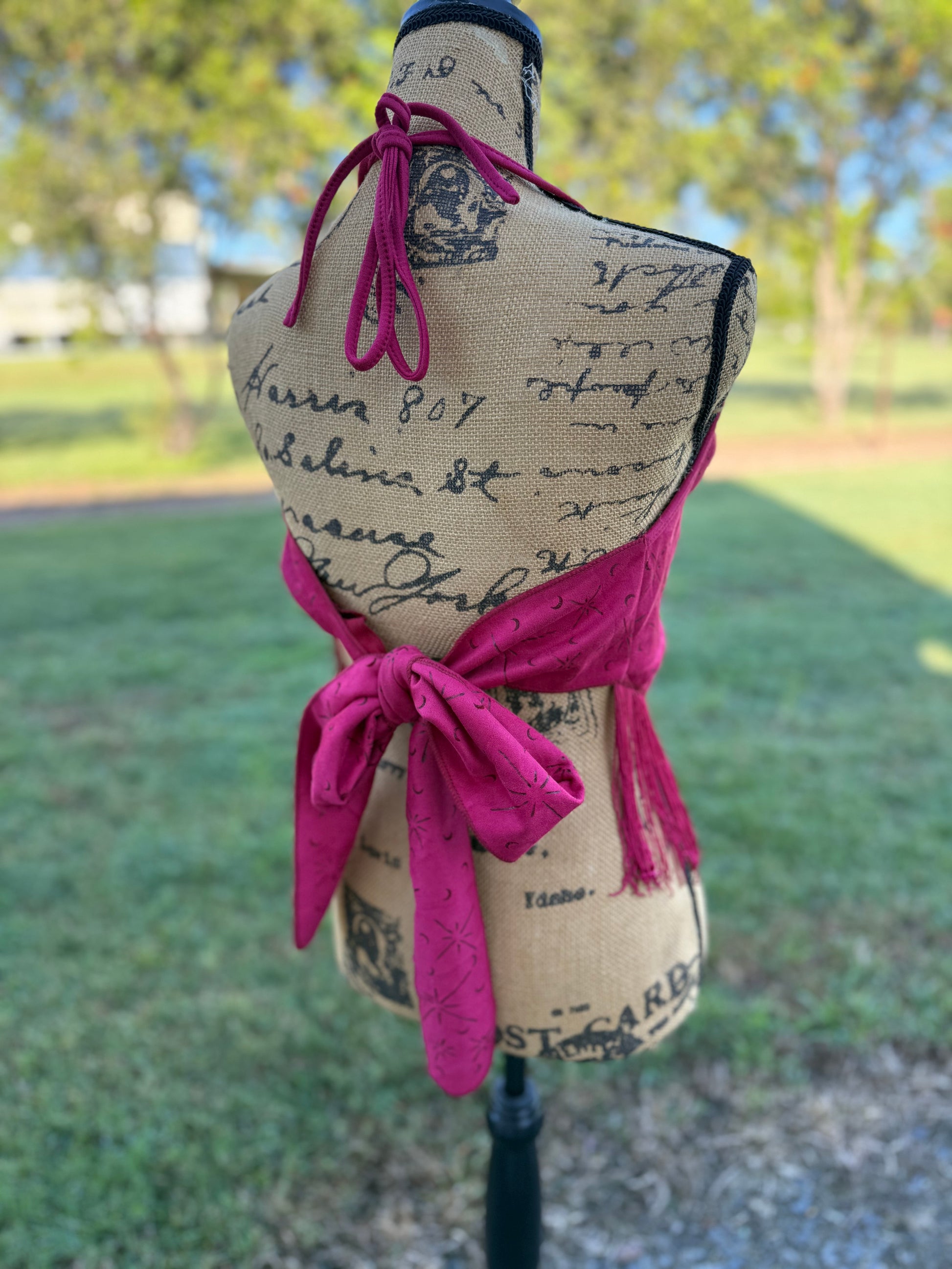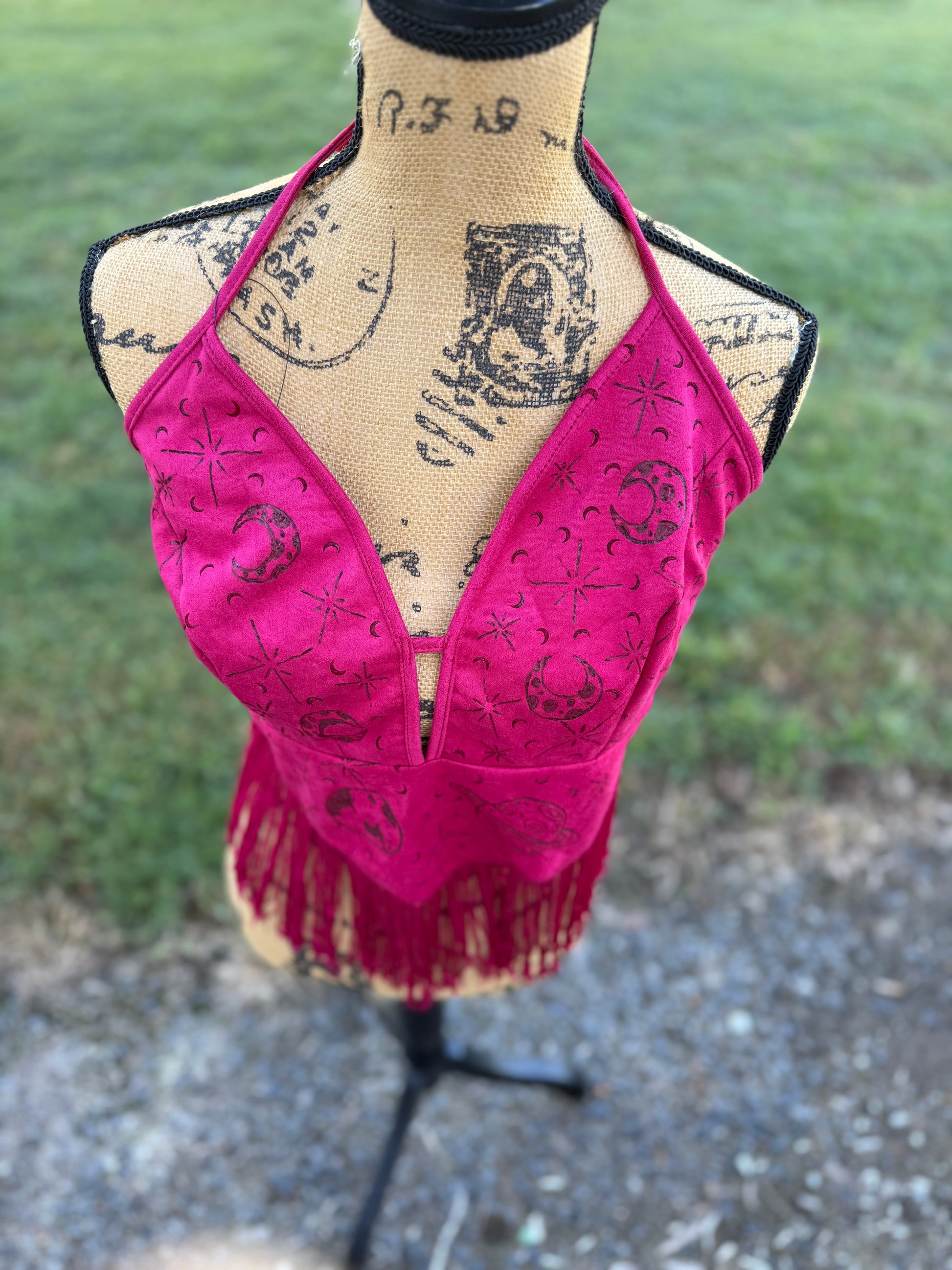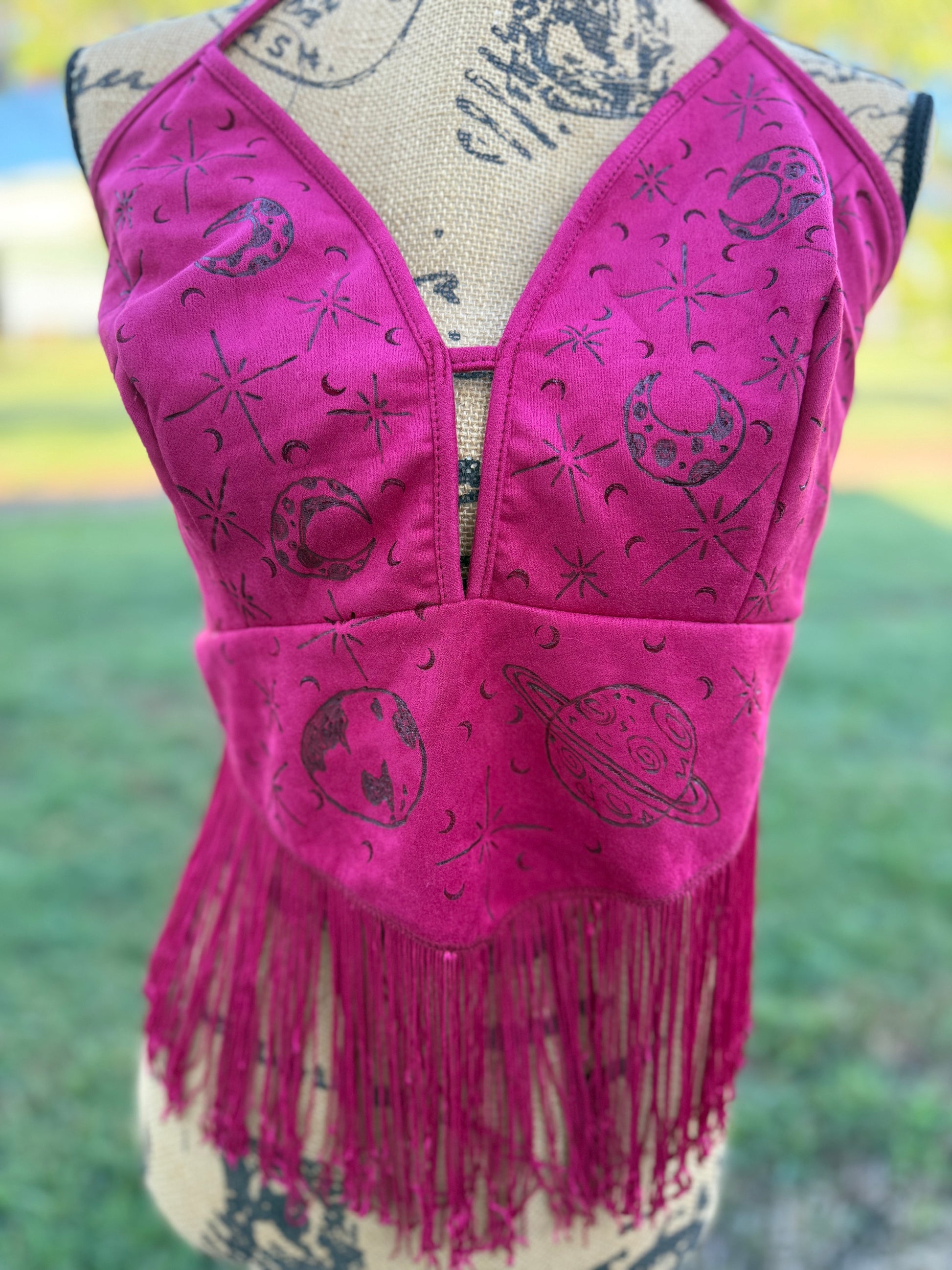 Step into your power with this magenta vegan suede piece, meticulously hand-burned with celestial moons, stars, and planets. Finished with a flowing fringe for that effortless boho edge, it's designed to flatter and empower.