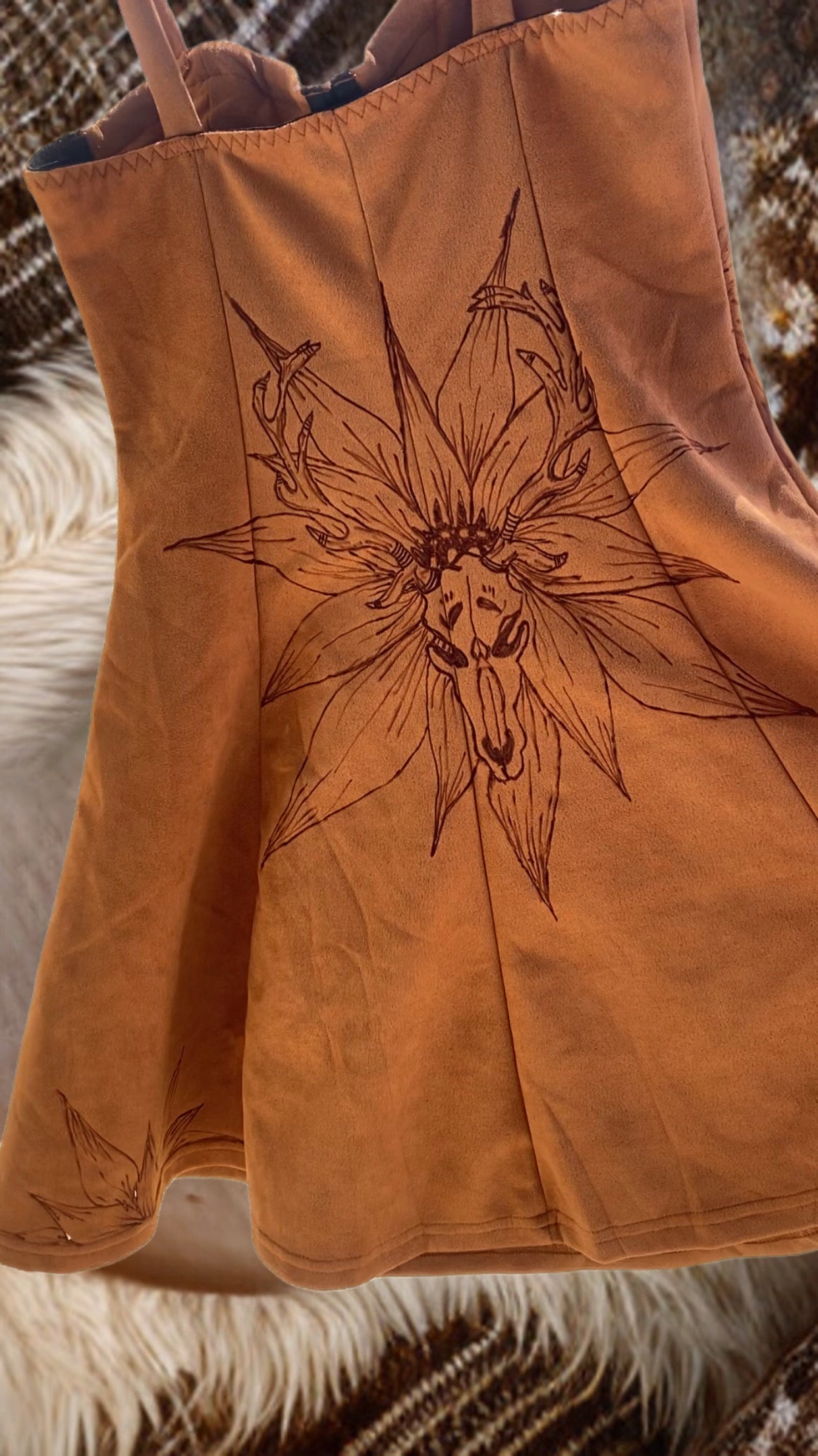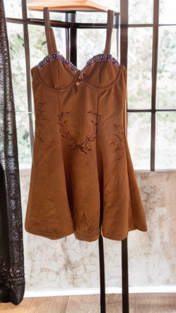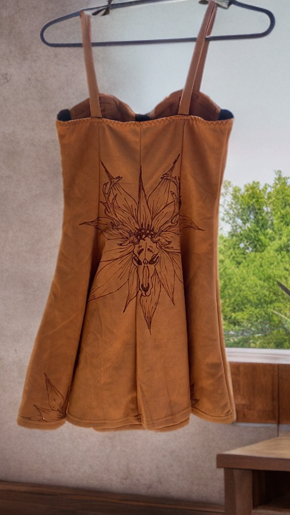 - Artful Design: Showcasing a striking burned design of whimsical skulls and horns intertwined with radiant sunflowers, this dress captures the essence of free-spirited style.